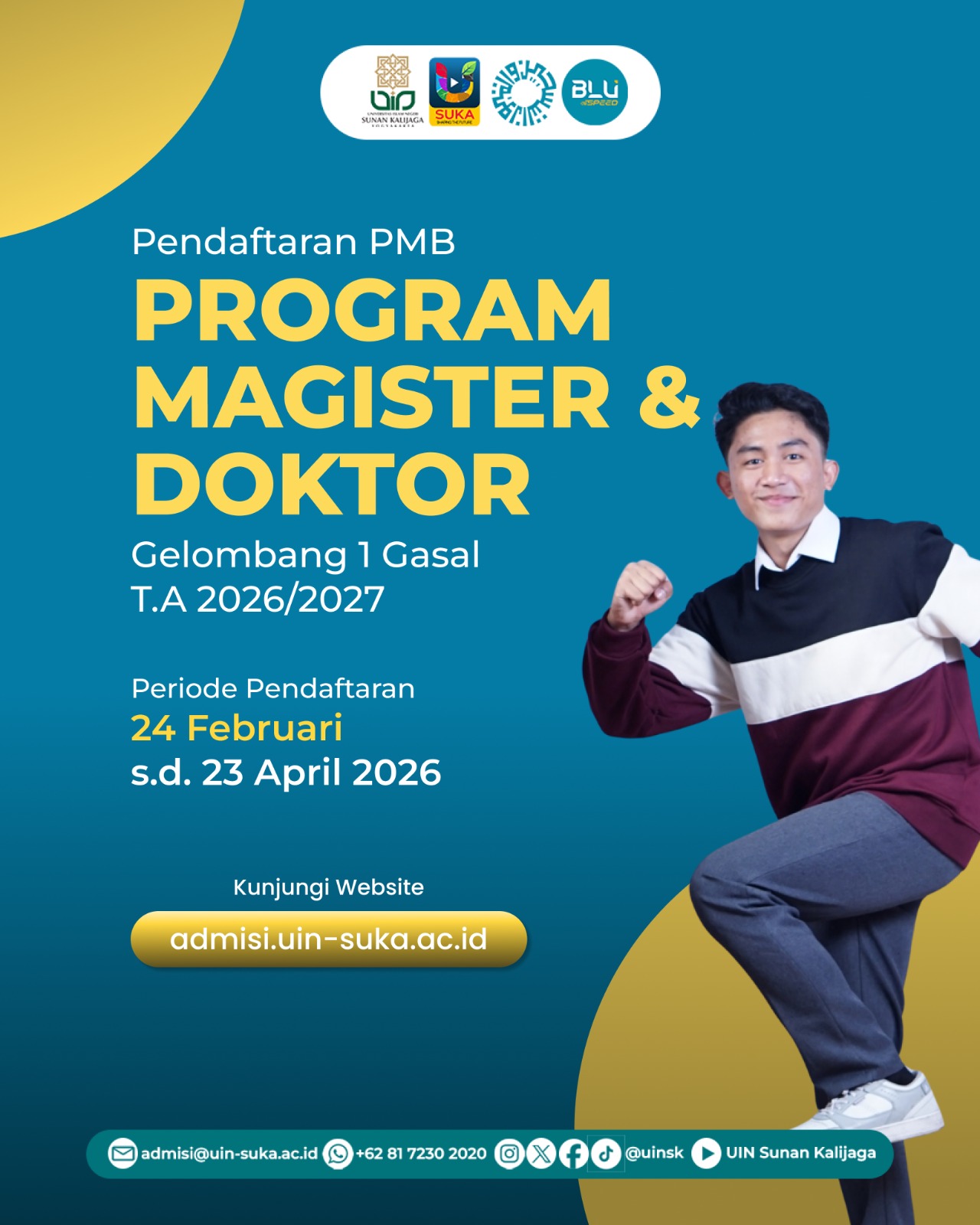 Informasi lengkap mengenai jadwal seleksi, persyaratan akademik, hingga mekanisme ujian dapat diakses pada website resmi admisi.uin-suka.ac.id atau menghubungi layanan admisi UIN Sunan Kalijaga melalui email admisi@uin-suka.ac.id, Instagram @admisi.uinsk, serta WhatsApp +62 81 7230 2020. Mari bergabung dan menjadi bagian dari komunitas akademik unggul UIN Sunan Kalijaga Yogyakarta.