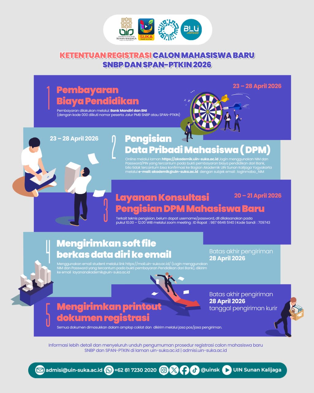 Untuk membantu kelancaran proses ini, UIN Sunan Kalijaga juga membuka layanan konsultasi pengisian DPM pada 20–21 April 2026 pukul 10.00–12.00 WIB secara daring melalui Zoom. Dalam proses pengisian DPM, mahasiswa diminta mengunggah dokumen penting seperti ijazah atau surat keterangan lulus serta akta kelahiran. Setelah selesai, mahasiswa akan mendapatkan barcode NIM dan dokumen pernyataan yang menjadi bagian dari kelengkapan registrasi.